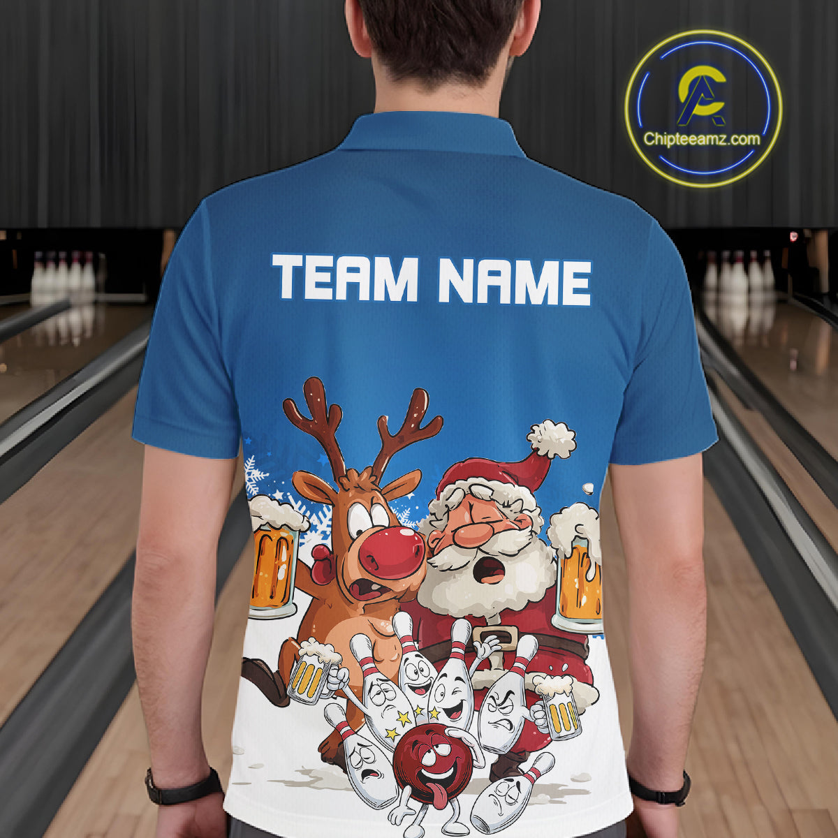 Custom Blue Funny Christmas Men Bowling Shirts, Bowling And Beer Xmas Party Shirt IPHW10205