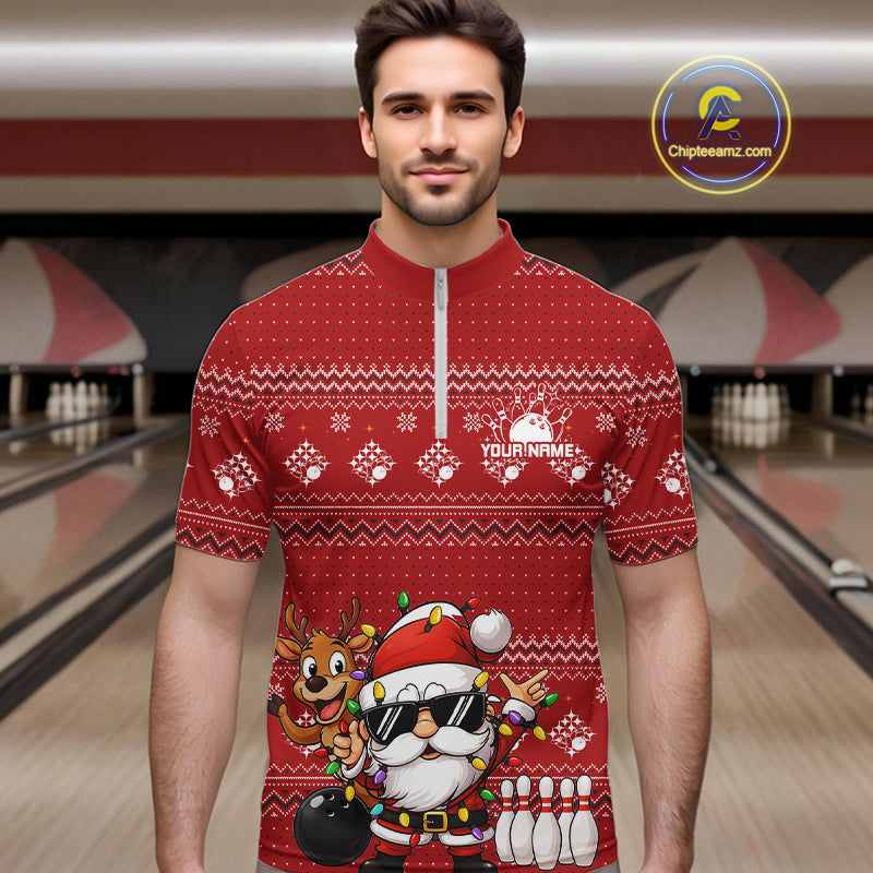 Custom Funny Christmas Men Bowling Shirts, Santa Claus And Reindeer Xmas Bowling Shirt IPHW10203