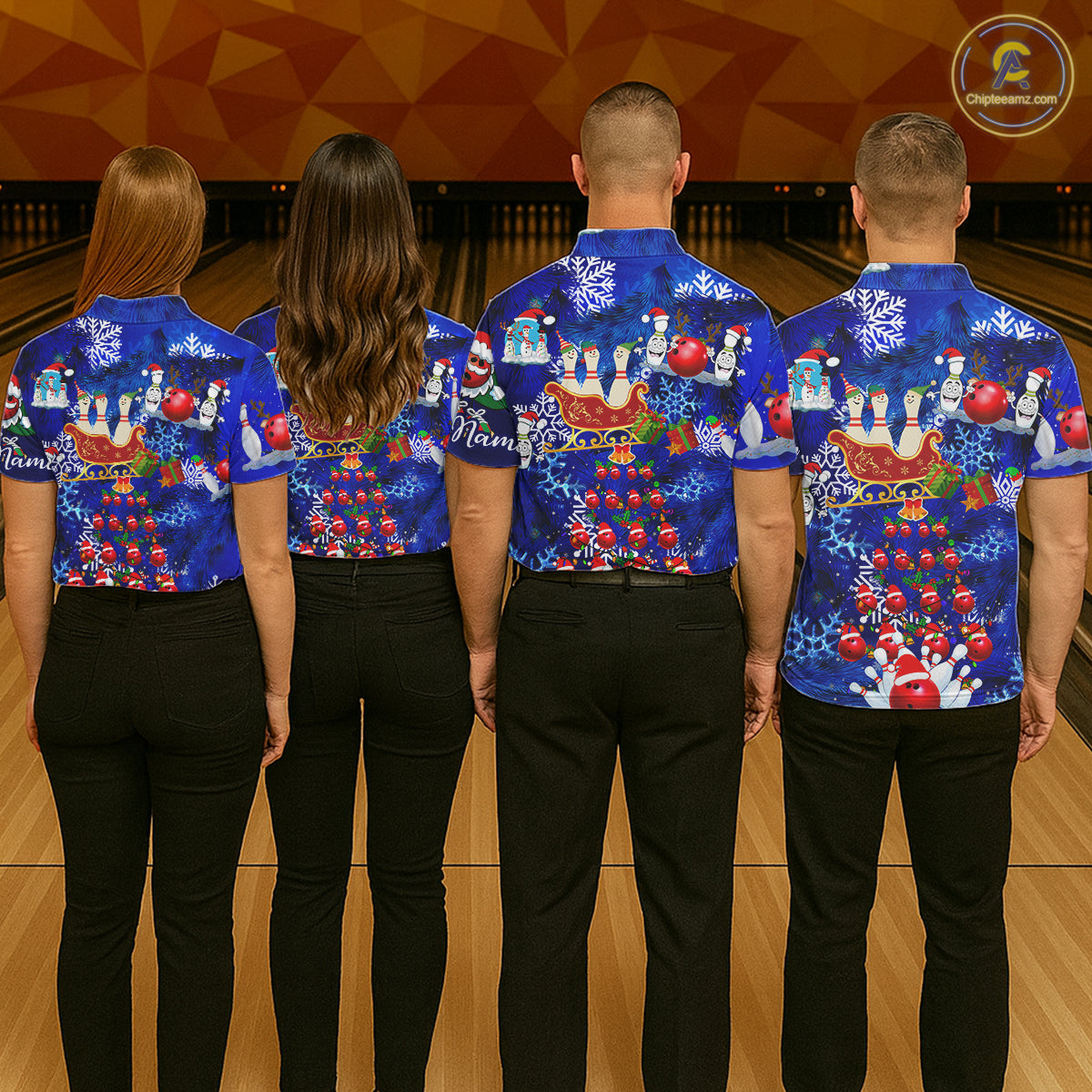 Womens Bowling Polo Shirts Custom blue Christmas pattern Bowling Santa ball pins team Ladies Jersey NQS6617