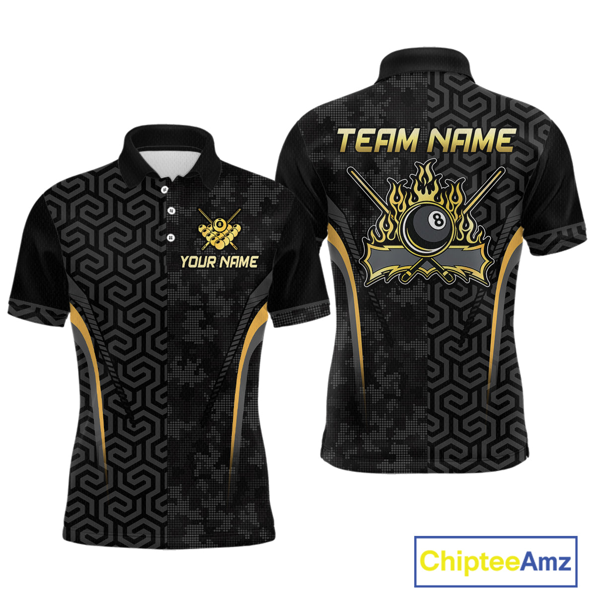Custom Black Gold 8 Ball Flame Billiard Shirts for Men, Billiard Team Polo & 1/4 Zip Shirts NNT61