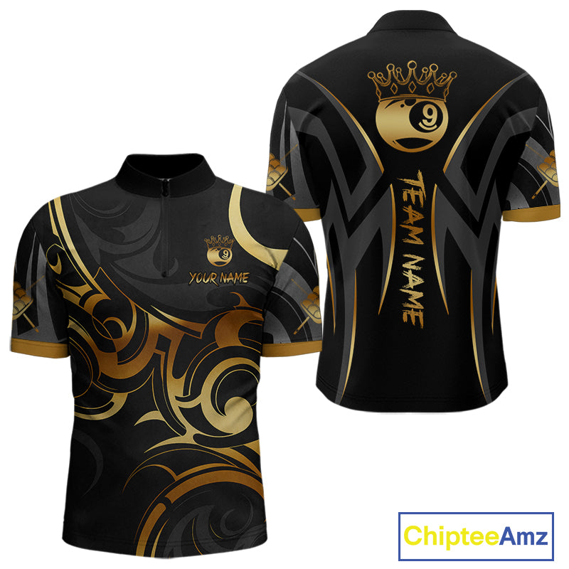 Black And Gold 9 Ball Crown Tribal Billiard Shirt For Men Custom Pool Team Jersey Polo & 1/4 Zip TDM4418