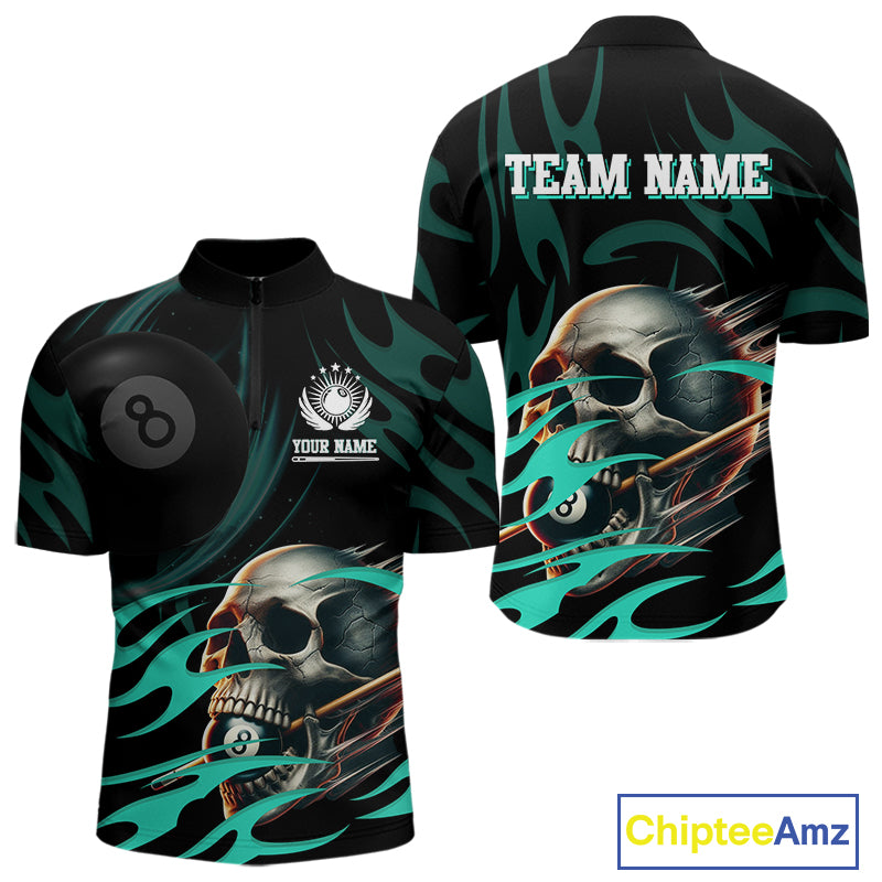 Turquoise Funny Skull 8 Ball Pool Shirt For Men Custom Billiard Team Jersey Polo & 1/4 Zip TDM4424