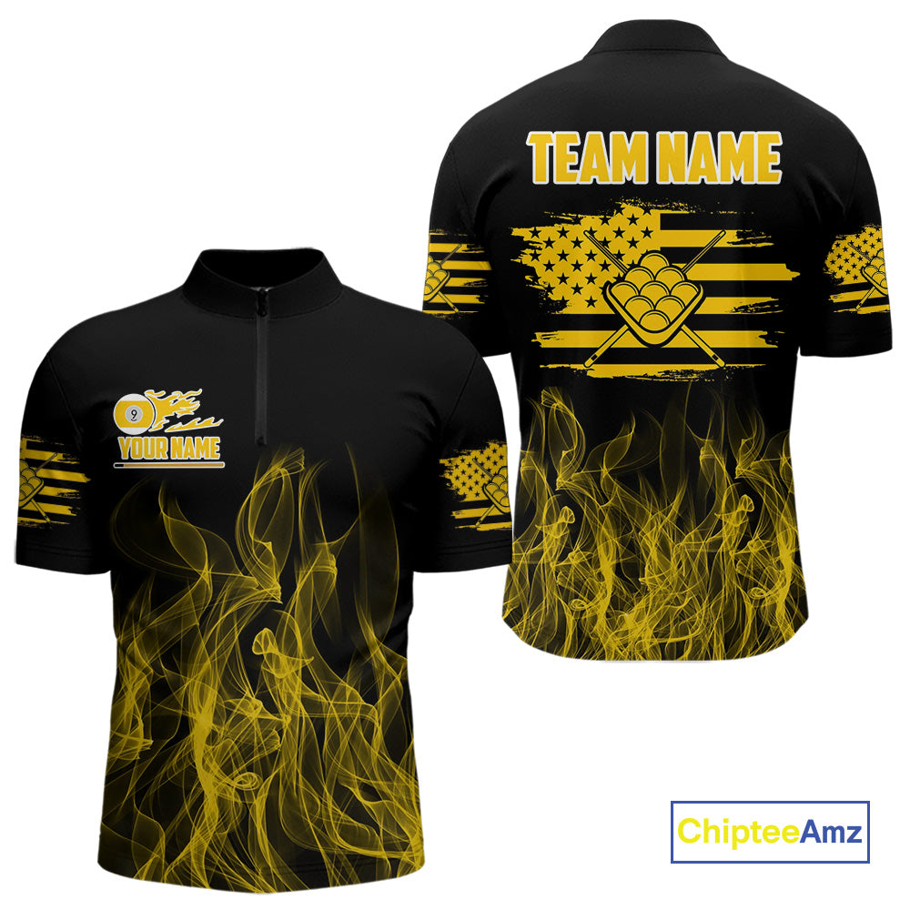 Yellow Flaming US Flag 9 Ball Billiard Shirt For Men Custom Patriotic Pool Player Team Jersey TDM4548