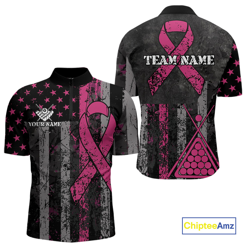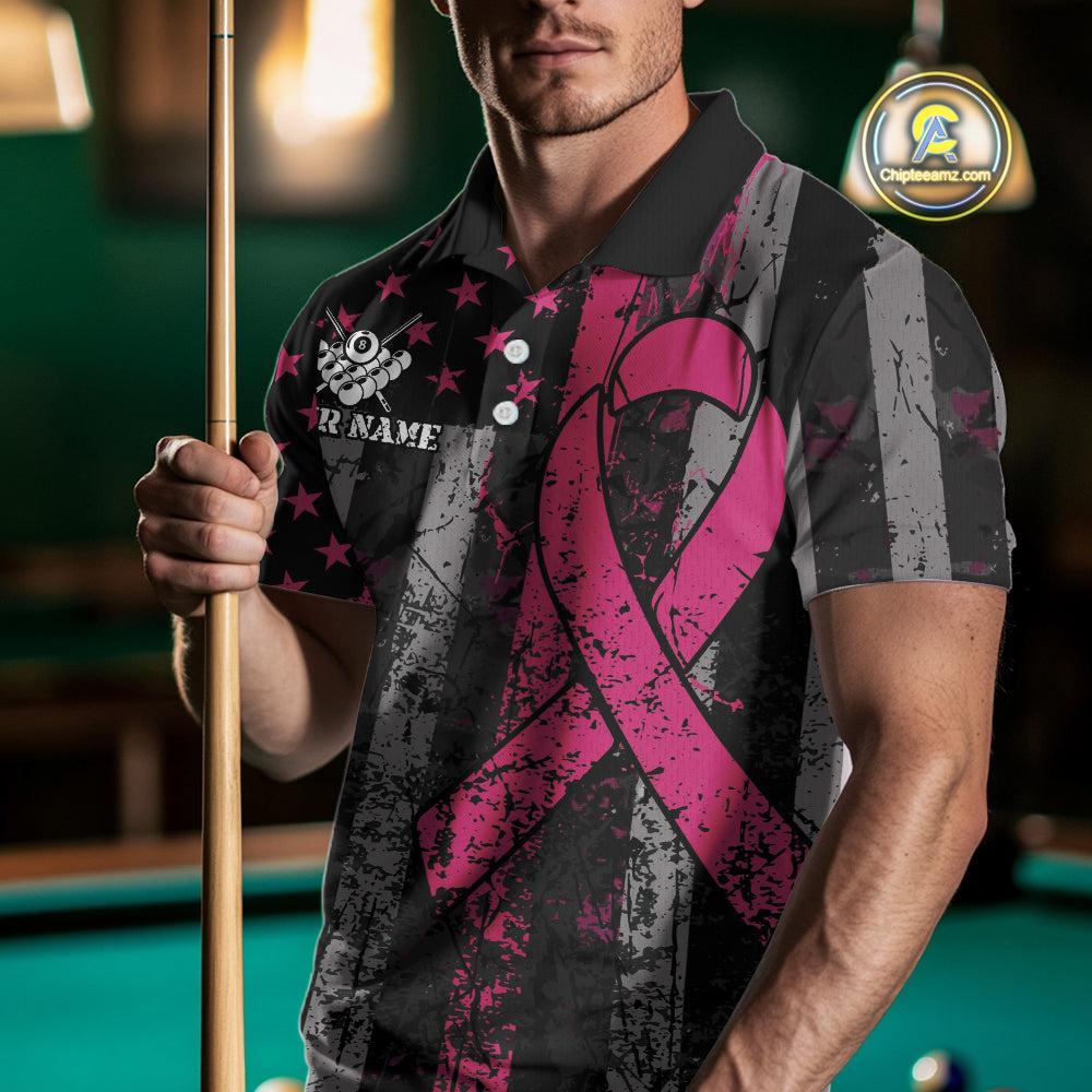 Custom Pink Ribbon Grunge US Flag Billiard Shirt For Men, Patriotic Breast Cancer Pool Team Jersey TDM4624