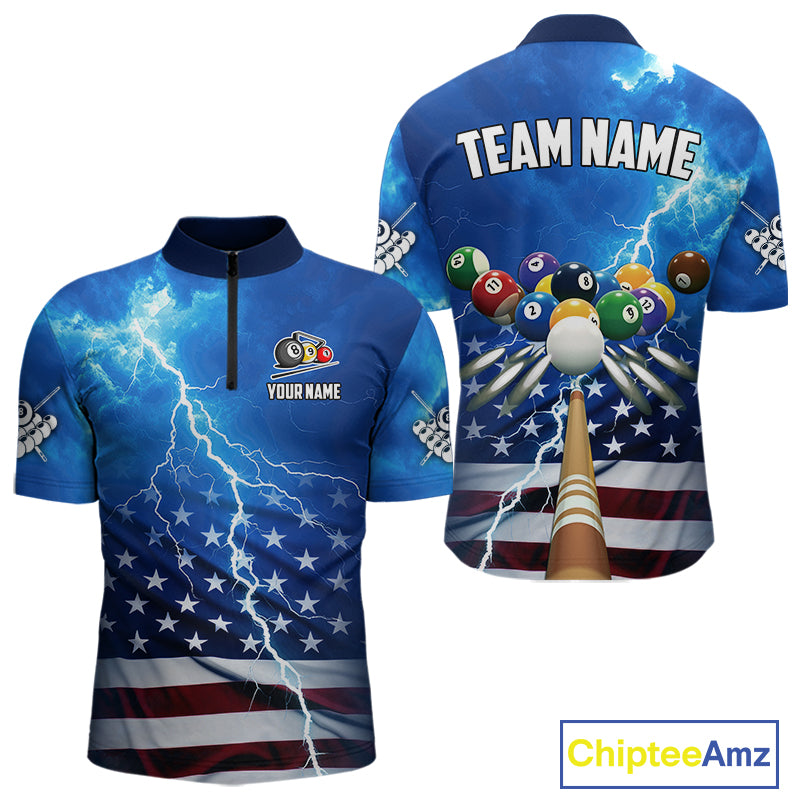 Blue Thunder Lightning American Flag Billiard Shirt For Men Custom Patriotic Pool Balls Jersey TDM4639