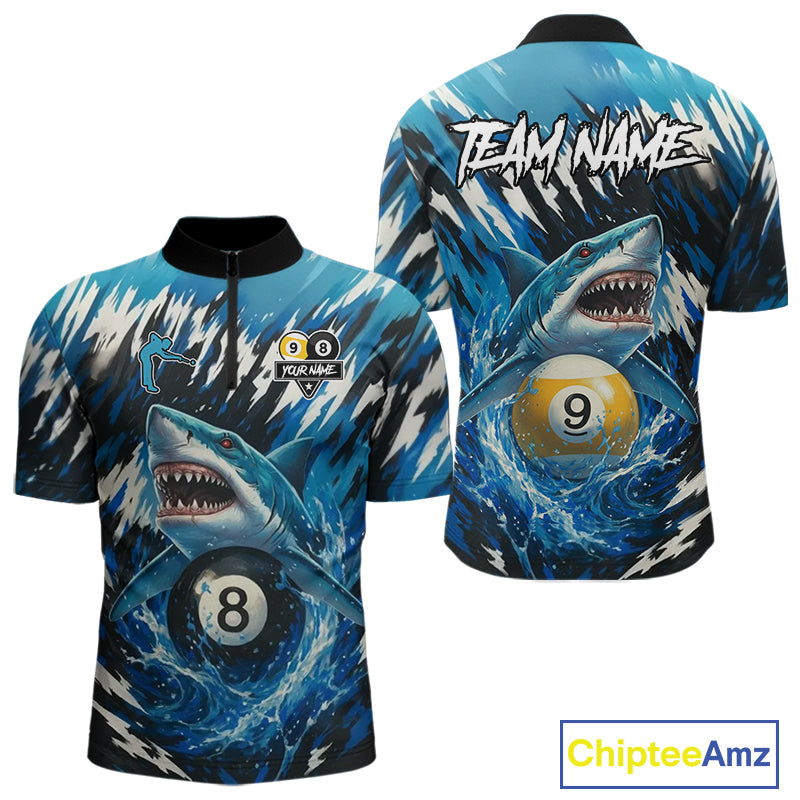 Custom Funny Blue Shark 8 Ball & 9 Ball Billiard Shirt For Men, Pool Team Shirt Polo & 1/4 Zip TDM5291