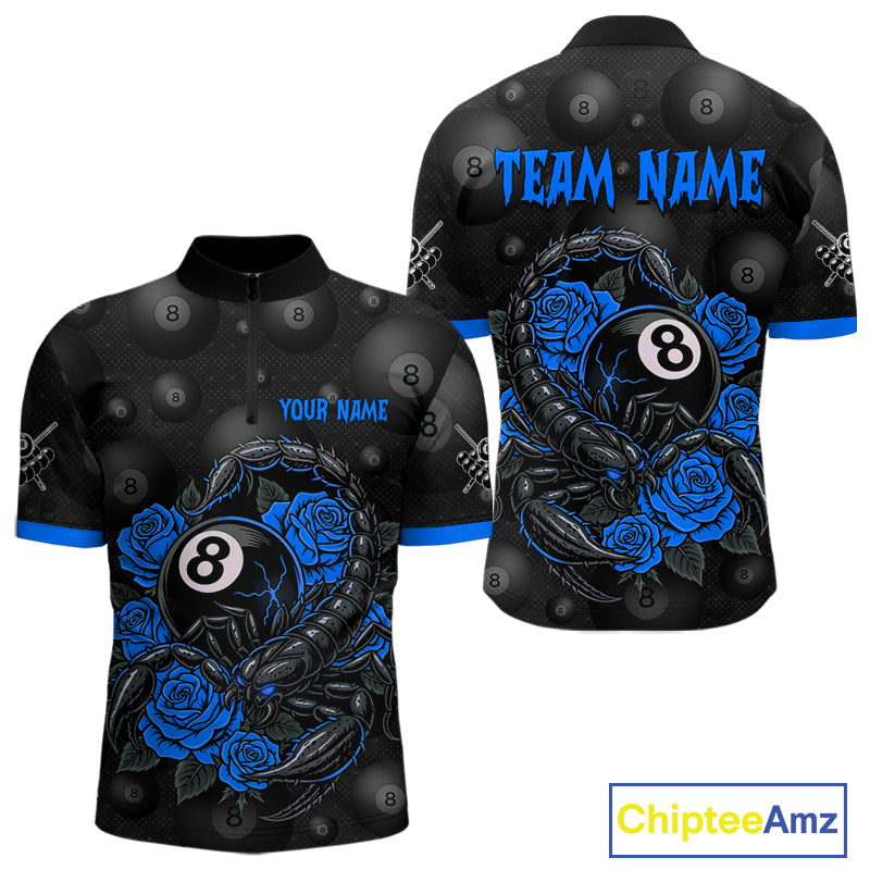 Black Blue 8 Ball Scorpion Roses Billiard Shirt For Men Custom Pool Team Shirt, Billiard Jersey TDM5346