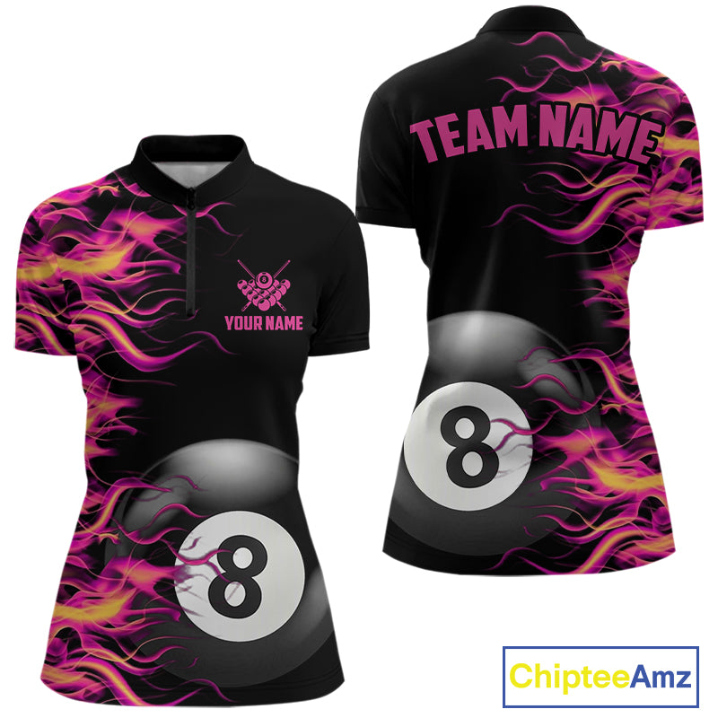 Pink Fire Flame 8 Ball Pool Billiard Shirt For Women Custom Billiard Team Jersey Polo & 1/4 Zip TDM4376
