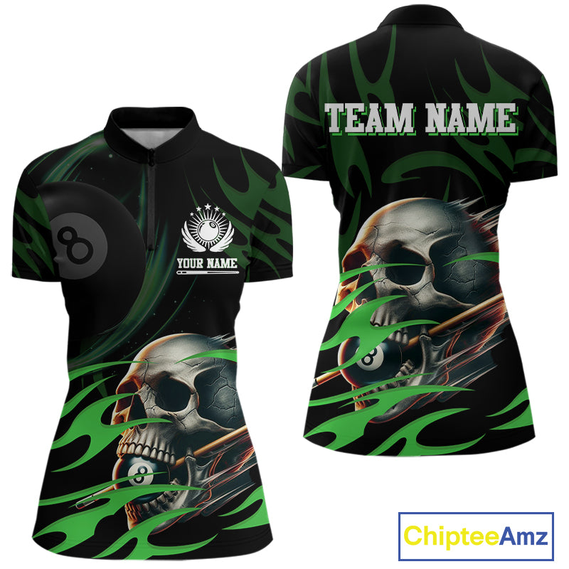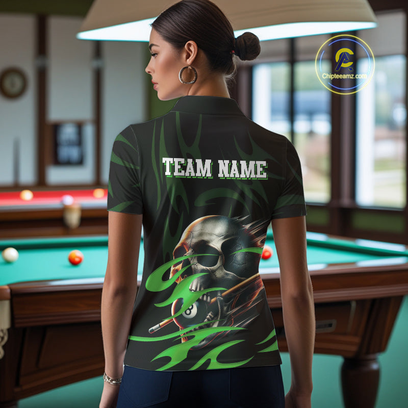 Green Funny Skull 8 Ball Pool Shirt For Women Custom Billiard Team Jersey Polo & 1/4 Zip TDM4425