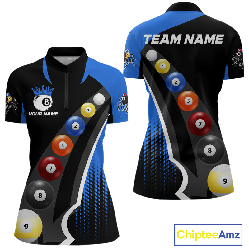 Personalized Black Blue Billiard Shirt For Women Custom Funny Pool Balls Team Jersey Polo & 1/4 Zip TDM4497