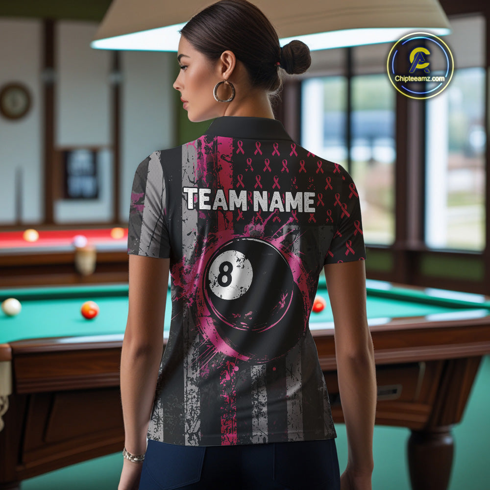 Custom Pink Ribbon Grunge US Flag Billiard Shirt For Women, Breast Cancer 8 Ball Pool Team Jersey TDM4500