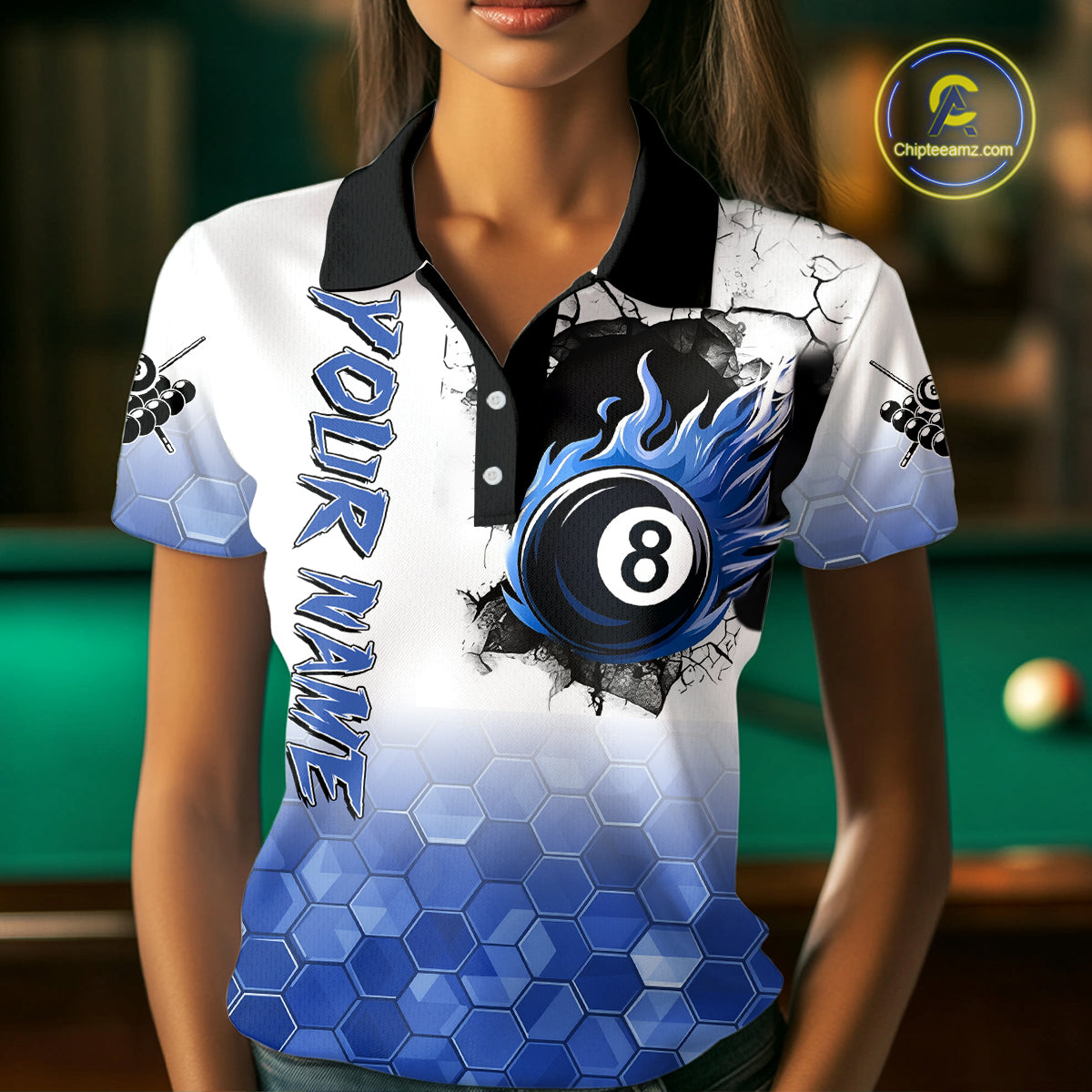 Custom White And Blue Hexagon 8 Ball Flame Billiard Shirt For Women, Funny Pool Team Jersey TDM4552