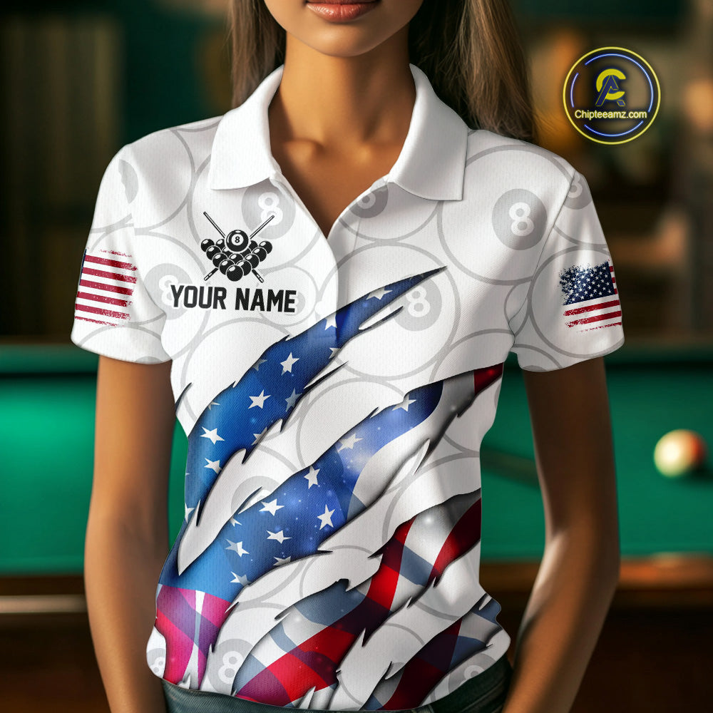 Custom Glowing American Flag 8 Ball Billiard Shirt For Women, Patriotic Billiard Team Jerseys |White TDM4596
