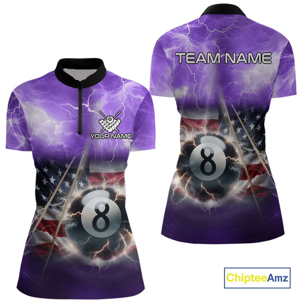 Purple American Flag Thunder Lightning 8 Ball Billiard Shirt For Women Custom Pool Team Jersey TDM4611