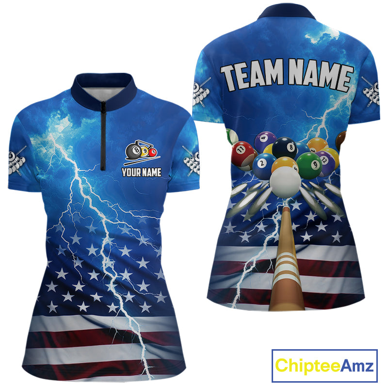 Blue Thunder Lightning American Flag Billiard Shirt For Women Custom Patriotic Pool Balls Jersey TDM4639