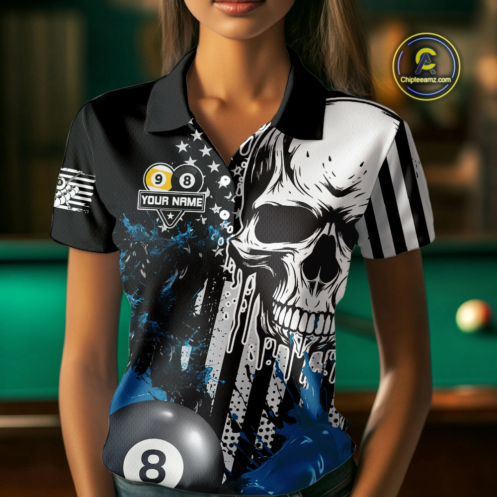 Personalized 8 & 9 Ball Pool Skull Billiard Shirt For Women Custom Grunge Billiard Team Jersey |Blue TDM4649