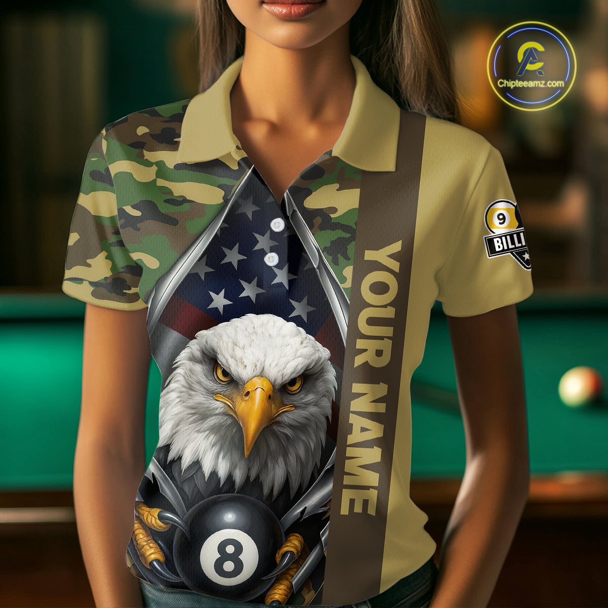 Green Camo American Flag Eagle 8 Ball & 9 Ball Pool Jersey For Women Custom Billiard Team Shirt TDM4659