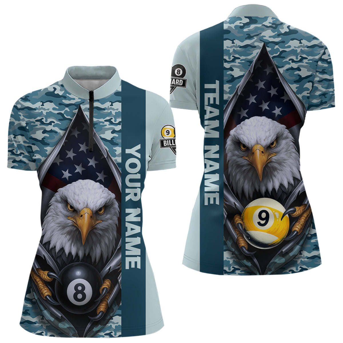Blue Camo American Flag Eagle 8 Ball & 9 Ball Pool Jersey For Women Custom Billiard Team Shirt TDM4660