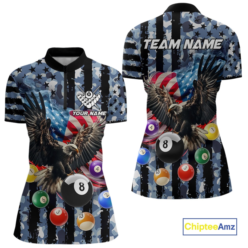 Blue Camo American Flag Eagle 8 Ball Billiard Shirt For Women Custom Patriotic Pool Team Jerseys TDM4809