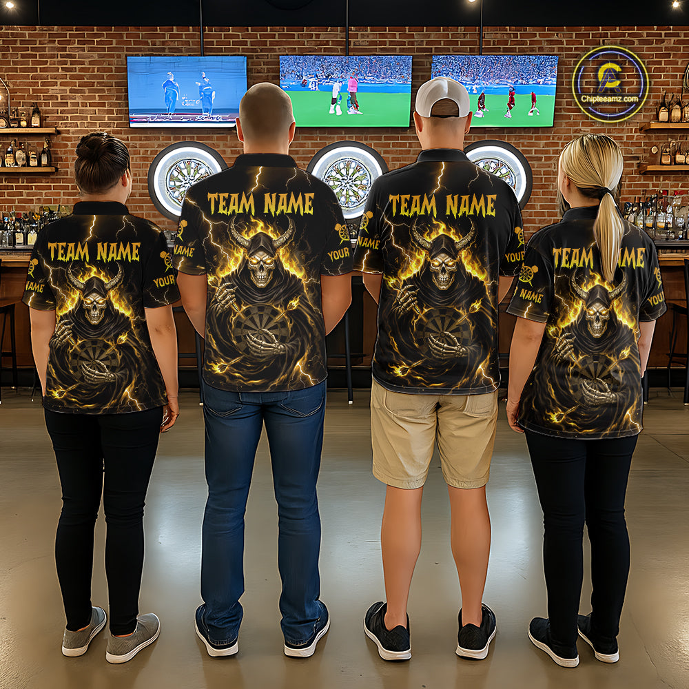Yellow Neon Flaming Grim Reaper Men Darts Polo Jerseys Custom Name Dart League Shirt NYN2066