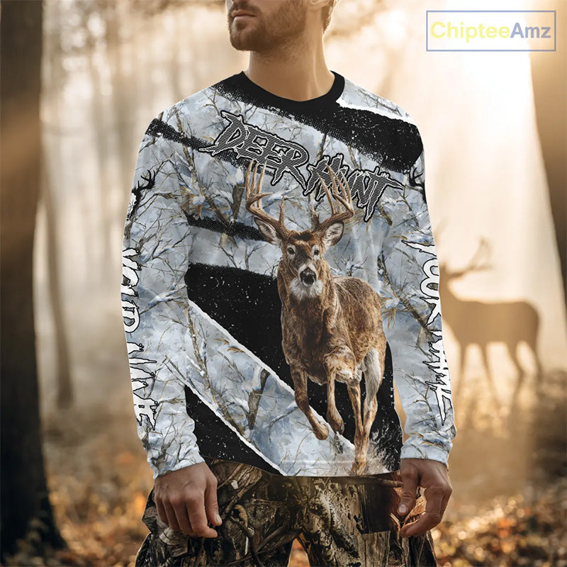 Winter Whitetail Deer Camo Customize Name 3D Printed Long Sleeve Hunting Shirts for Men, Hunting Gifts NBT260