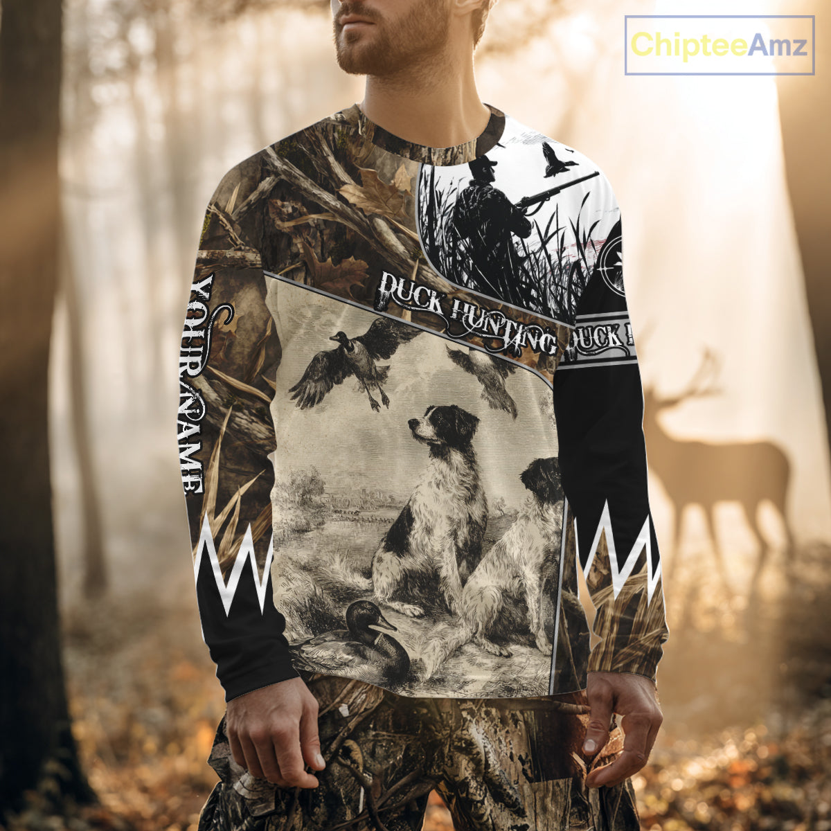 Designed for duck hunters and outdoor enthusiasts, this shirt combines style, comfort, breathability, and functionality in one. Featuring a unique waterfowl-inspired design, it can be personalized with your name, along with details like the American flag, realistic grass camo patterns, and even your loyal hunting dog – making it the perfect gift idea for hunters during duck hunting season.