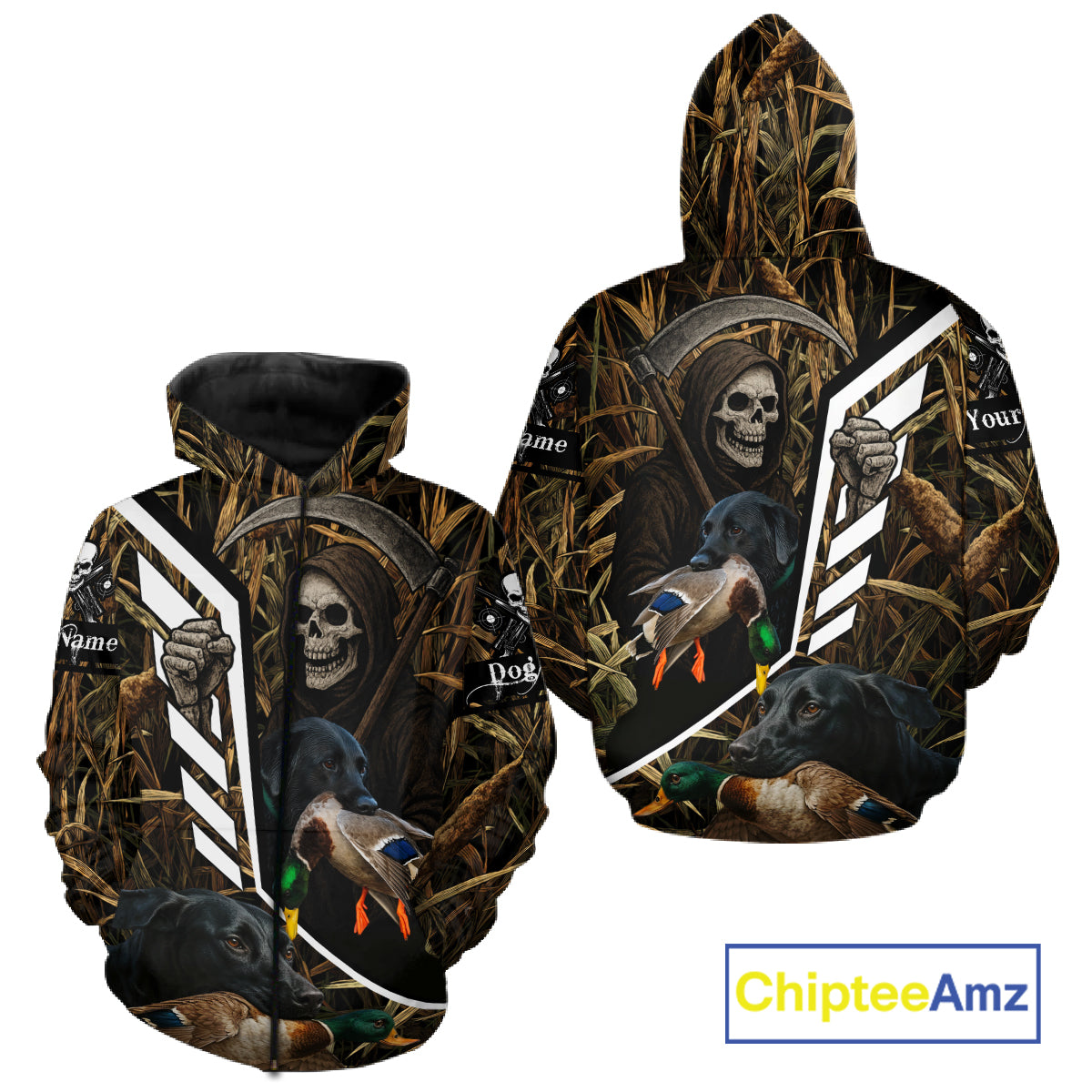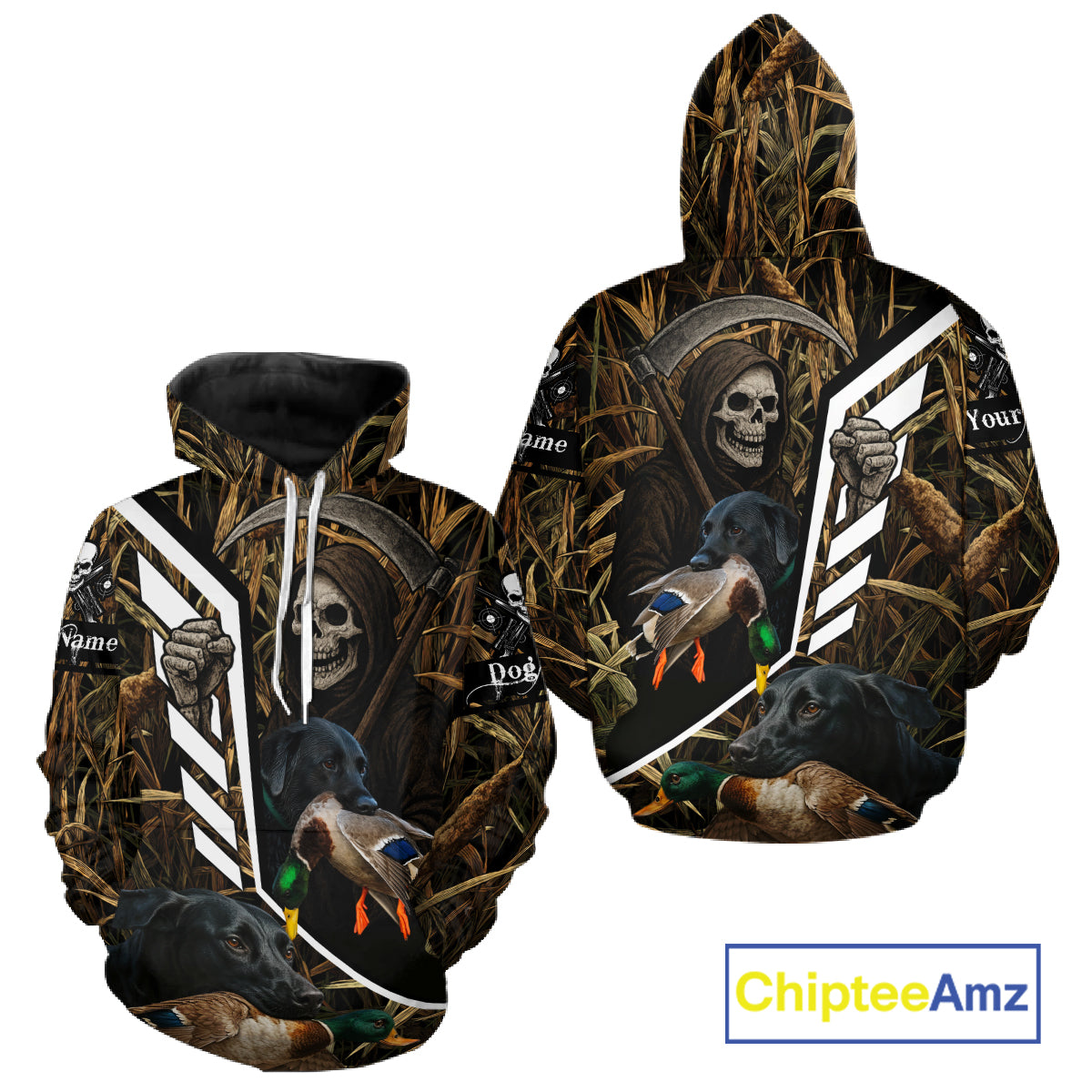 Waterfowl Hunting Shirt Camo Personalized with Black Lab Dog and Grim Reaper, Hunting Gifts NHT168