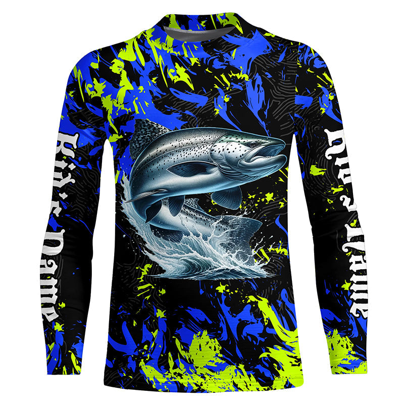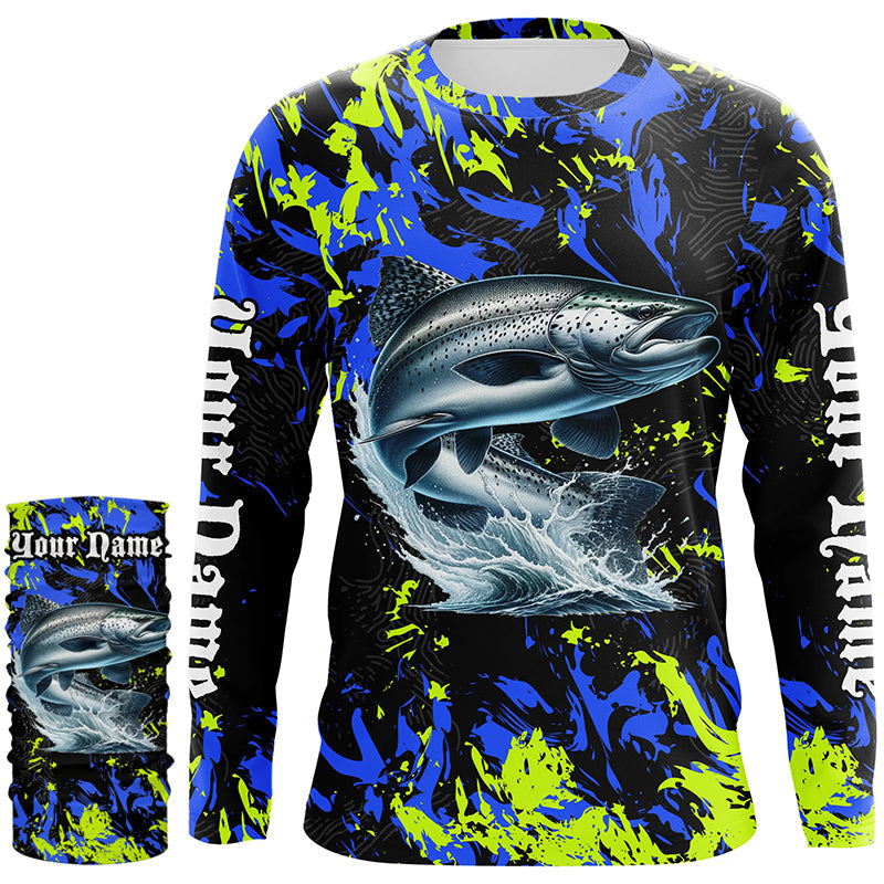 Chinook salmon fishing green blue camo Custom performance long sleeve fishing shirt, salmon jerseys NQS7217