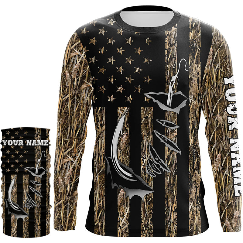Personalized American Flag Camo Fishing Jerseys, Fish hook camo patriotic Long Sleeve Fishing Shirts NQS8920