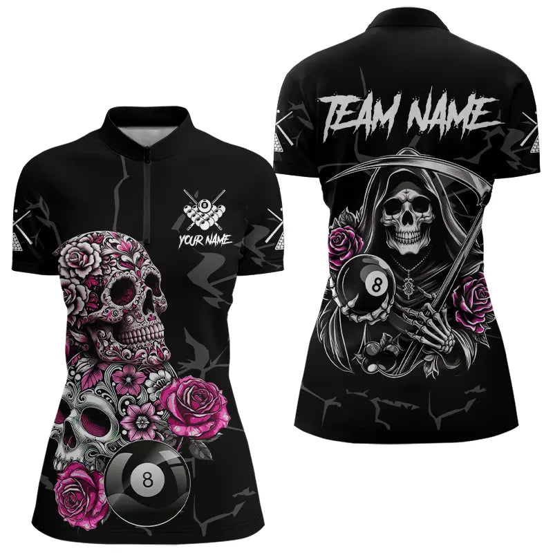 Personalized Pink Funny Skull Roses 8 Ball Billiard Shirts For Women Custom Pool Team Shirts TDM3729