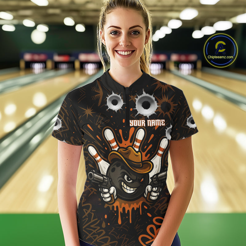 Funny Black & Orange Bowling Cowboy gun Women bowling polo, 1/4 zip shirt Custom bowling team jersey NQS10688