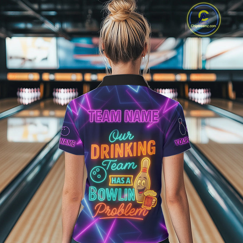 Our Drinking Team has a bowling problem Custom colorful neon funny bowling and beer shirts for Women NQS11126