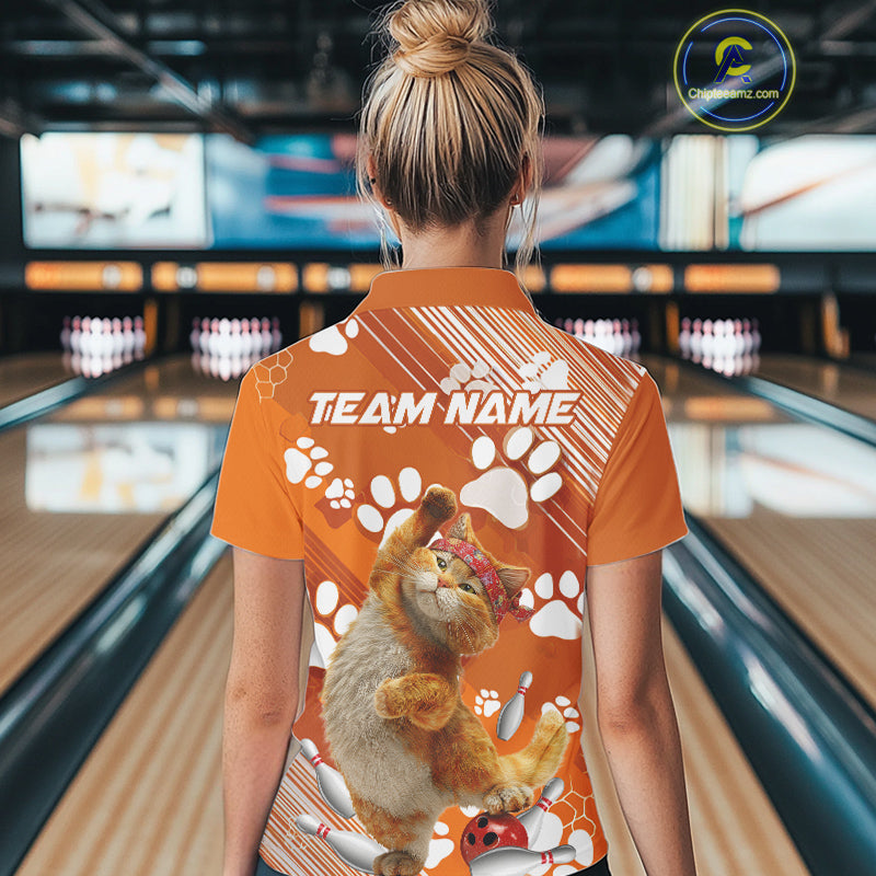Custom Funny Orange Cat Bowling Women Polo Shirt, Cute Team Cat Paw Bowling Shirt IPHW10101