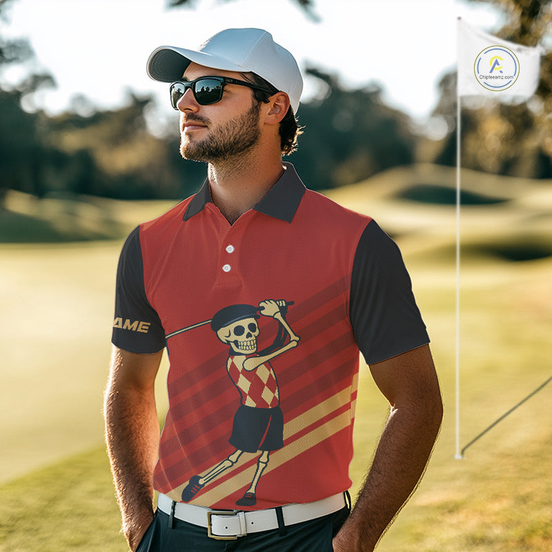 Funny argyle pattern Skull Golf Polo Shirts for men Custom mens golf attire, cool golf gifts | Red NQS10251