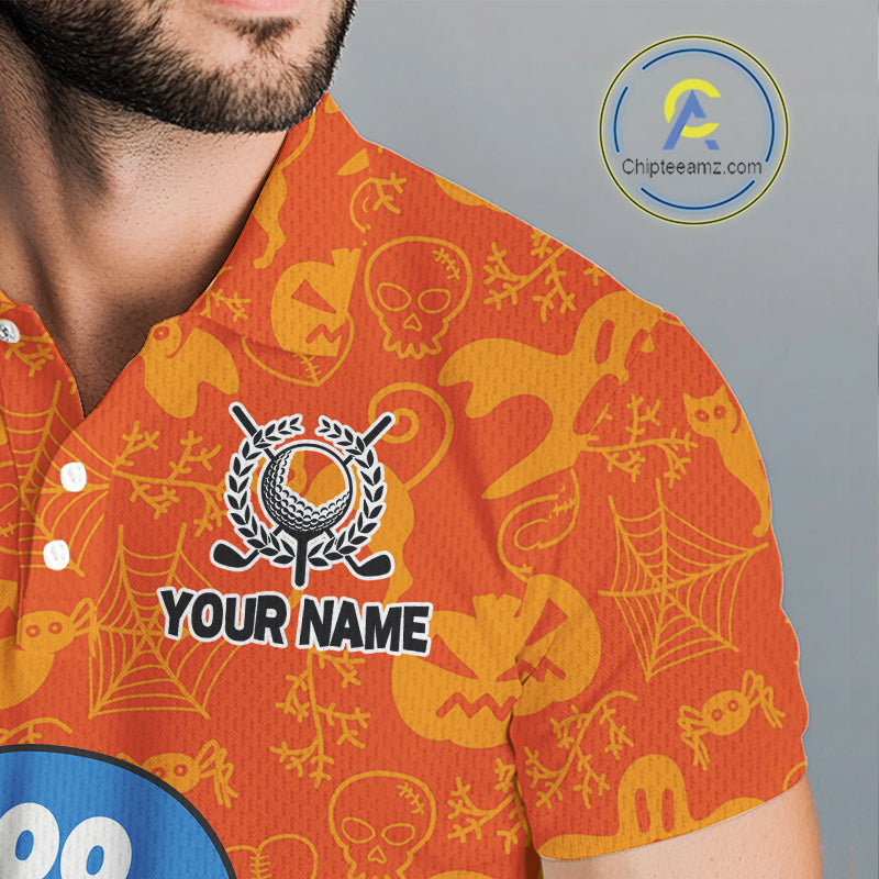 Personalized Funny Halloween Boo Orange Pattern Golf Polo Shirts For Men, Halloween Mens Golf Attire NQS10837