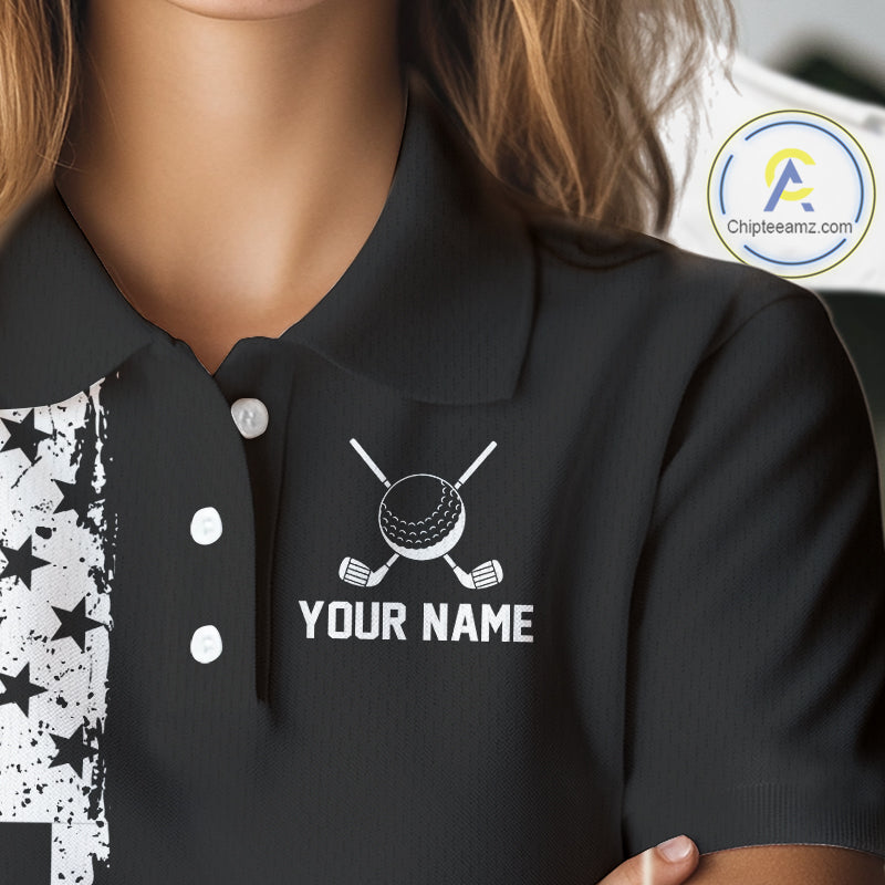 Black and White American Flag Women golf polo shirts Custom name patriotic team golf uniform NQS10018