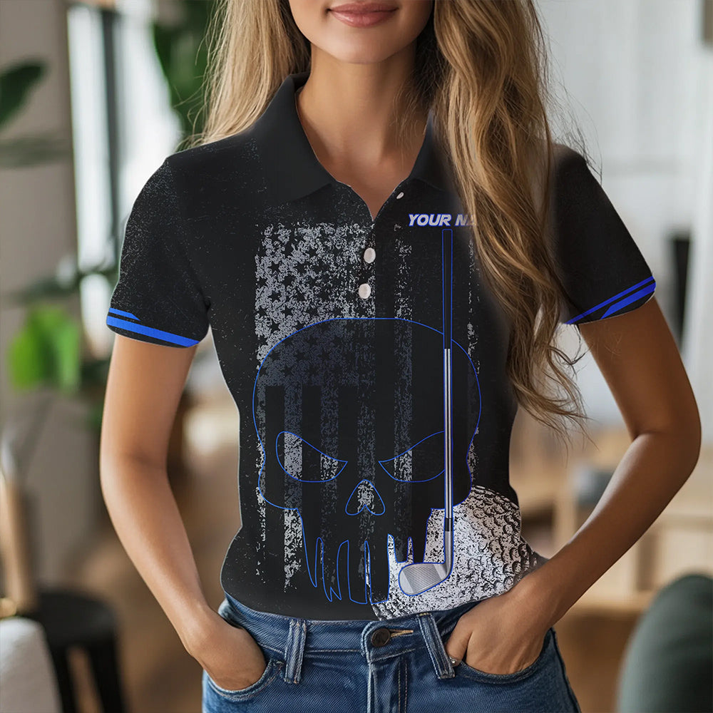 Black & White grunge American Flag Skull Women golf polo shirts custom golf attire for ladies | Blue NQS9344