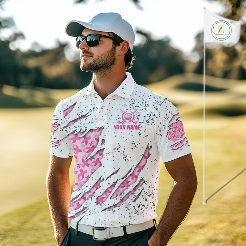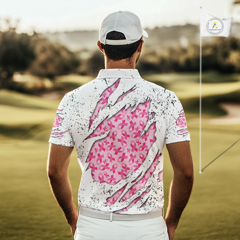 Pink ribbon white grunge pattern Mens golf polo shirt custom breast cancer awareness mens golf top NQS10386