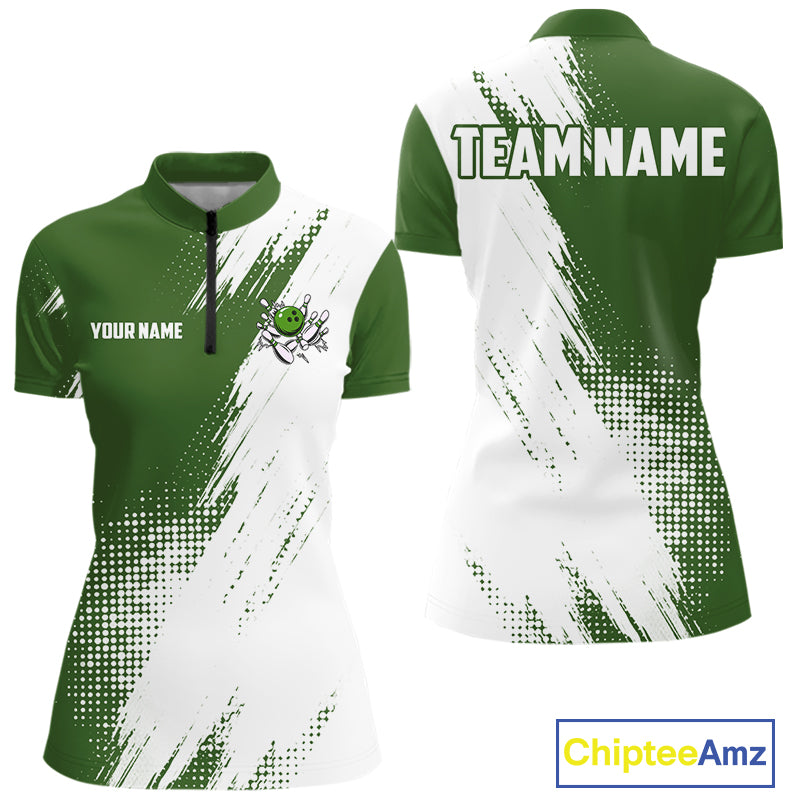 Custom Green and White Strike Bowling Shirts Women Polo, 1/4 Zip Bowling Team Jerseys Bowling League NQS11037