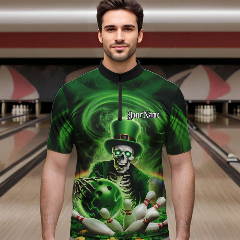 Custom Green St Patricks Day Skull Bowling Quarter-Zip Shirts For Men, Shamrock Bowling Shirt IPHW8377