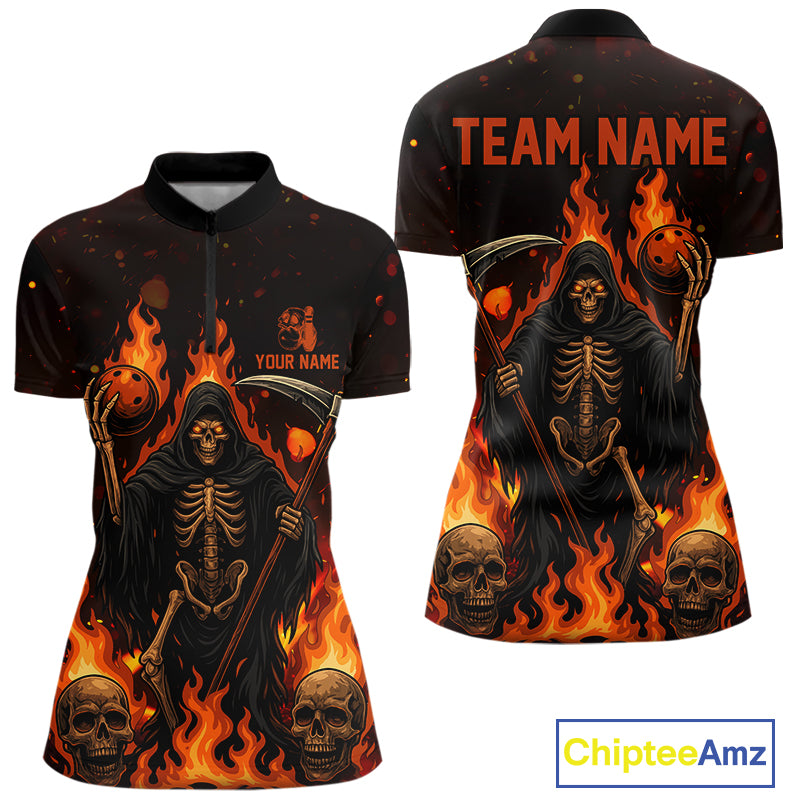Black And Orange Flame Reaper Skull Custom Halloween Bowling Team Shirts For Women, Bowling Gifts NQS10835