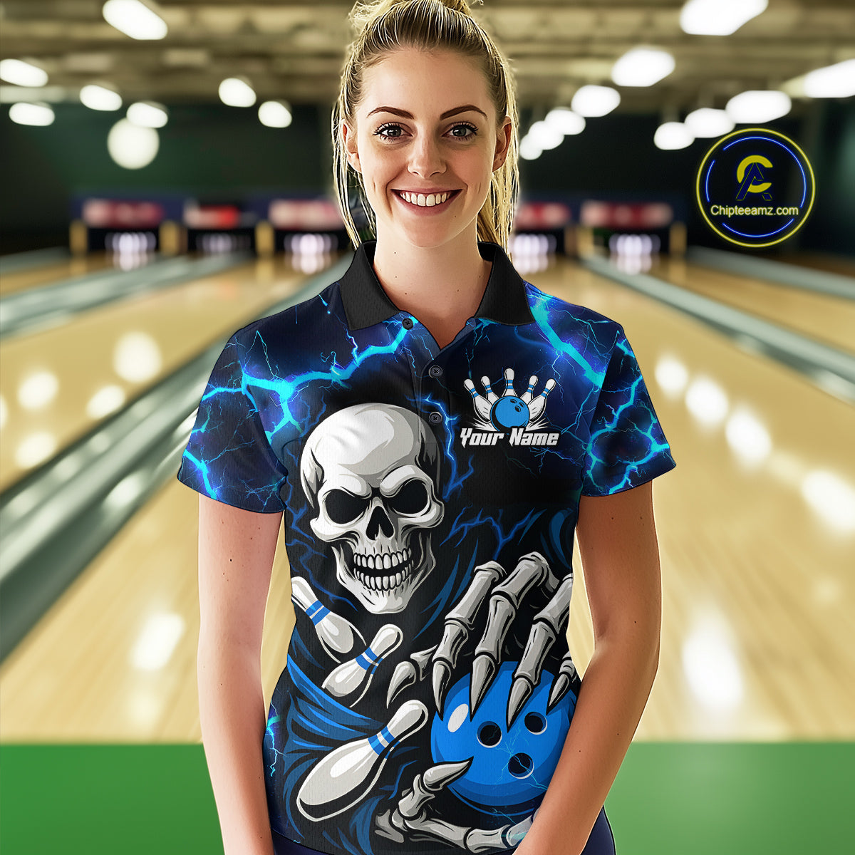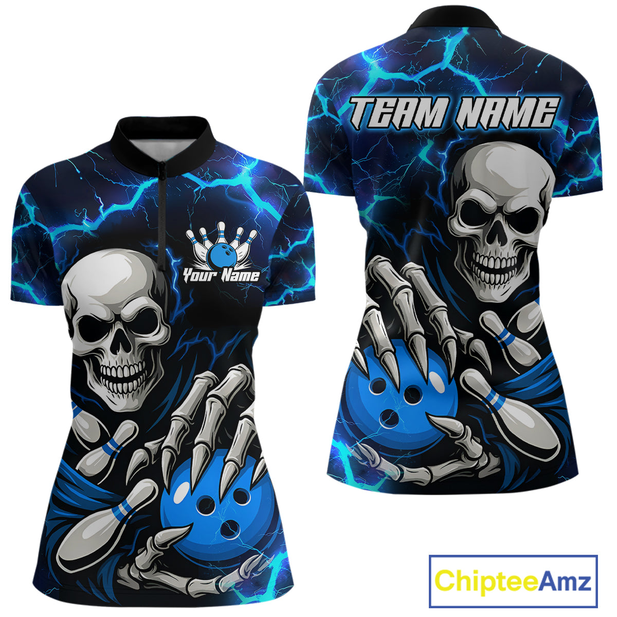 Custom Blue Lightning Thunder Skull Bowling Shirts For Women, Halloween Bowling Team Jerseys NQS10720