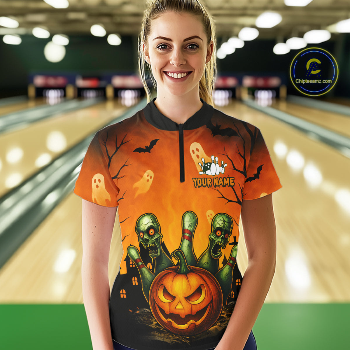 Custom Orange Bowling Team Shirt for Women Funny Pumkin Bowling Jersey Halloween QZT774