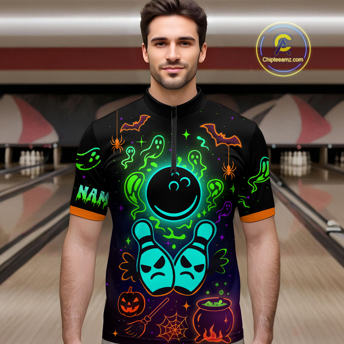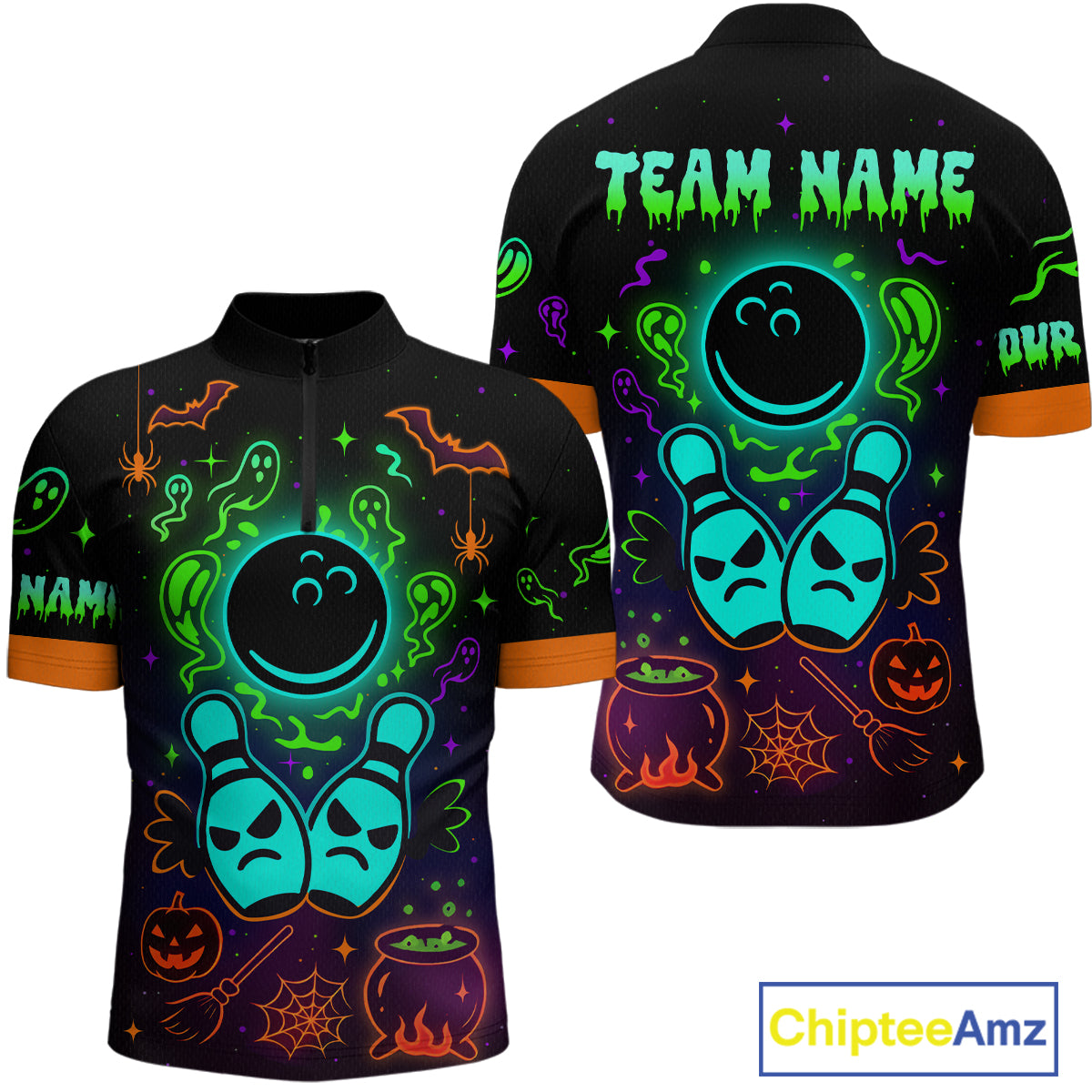 Custom Neon Bowling Team Shirt Halloween Polo & Quarter-Zip Bowling Jersey for Men QZT731