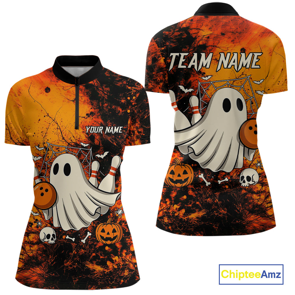 Custom Orange Boo Bowling Women Polo, Quarter Zip Shirts Bowling League Team Jersey Halloween Outfits NQS10523