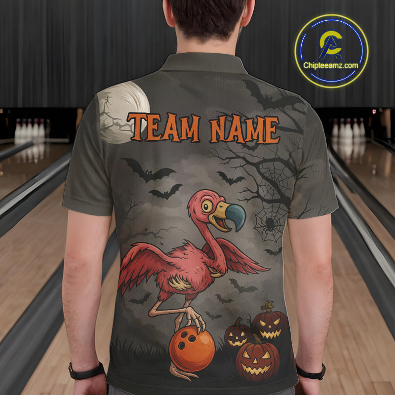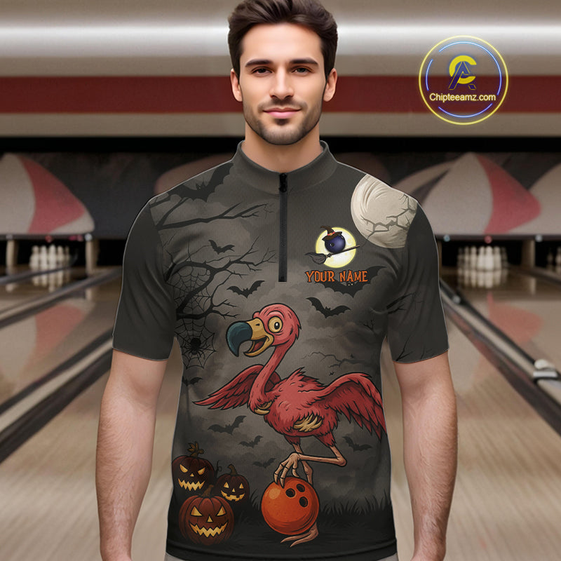 Funny Flamingo Halloween Bowling Polo, Quarter Zip Shirt For Men Custom Halloween Bowling Team Jersey NQS10703