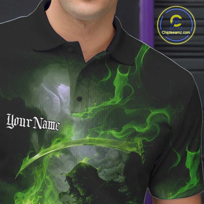 Custom Electric Green Fire Grim Reaper Bowling Polo Shirts For Men, Halloween Bowling Shirt IPHW9465