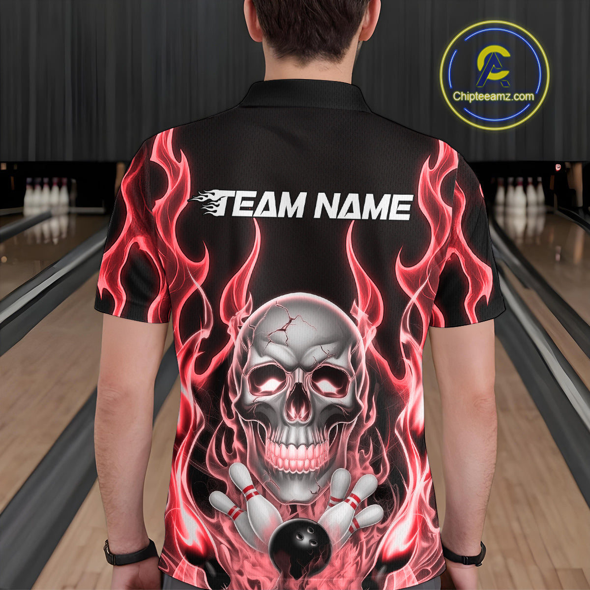 Custom Red Fire Flame Skull Bowling Polo Shirts For Men, Halloween Bowling Team Outfit IPHW9492