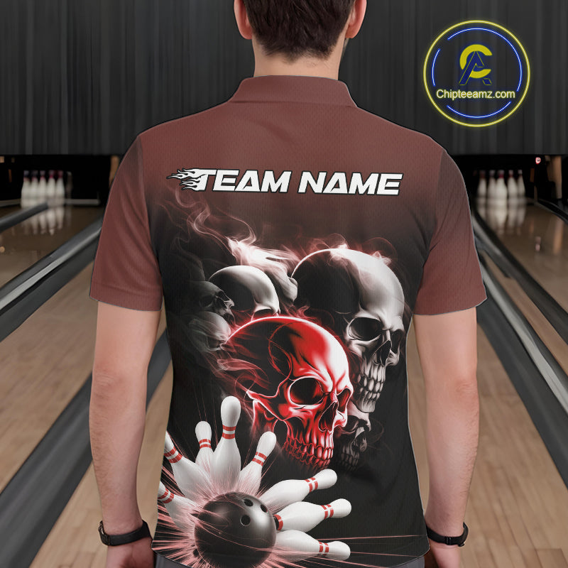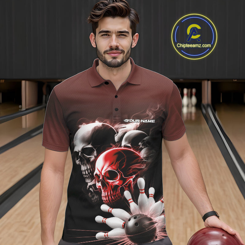 Custom Red Smoke Skull Bowling Polo Shirts For Men, Ghostly Halloween Bowling Outfit IPHW9520