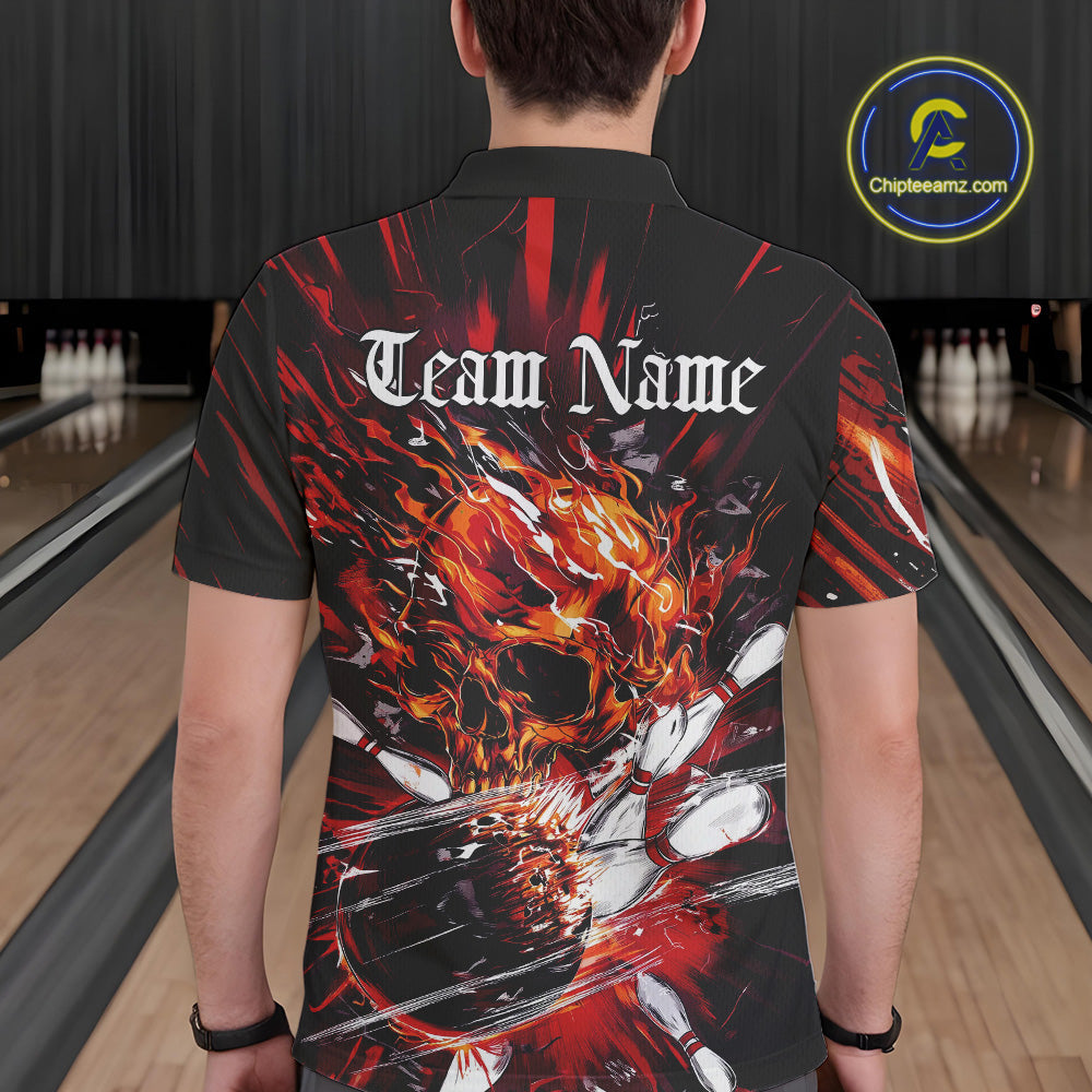 Custom Flame Skull Bowling Team Men Polo Shirts, Fire Halloween Bowler Outfit Uniform IPHW9583